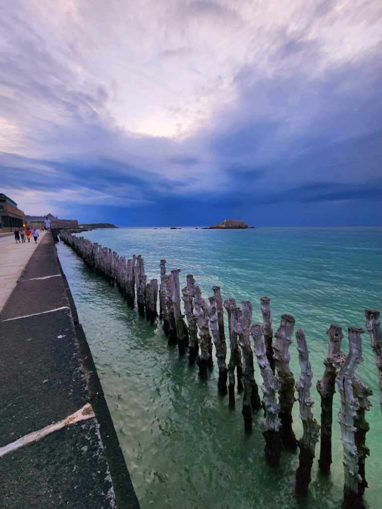 サンマロの海に打ち付けられている3,000本もの杭は、防波堤を乗り越えてくる高潮を食い止めるための消波杭であり、ムール貝の養殖でも活躍した杭です。(現在は、養殖はしていない)