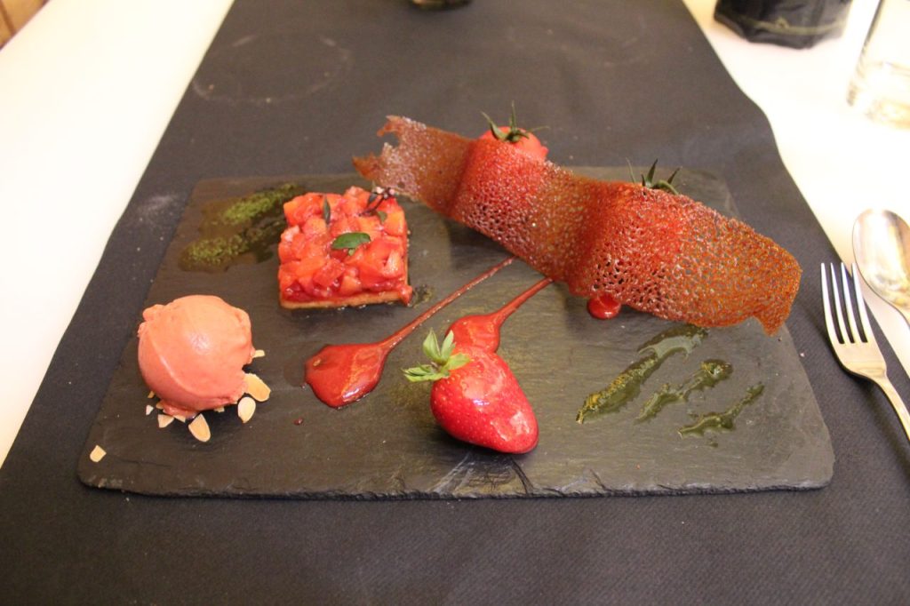 Déclinaison de la fraise et tomate au poivre de Jamaïque, sorbet fraise basilic.