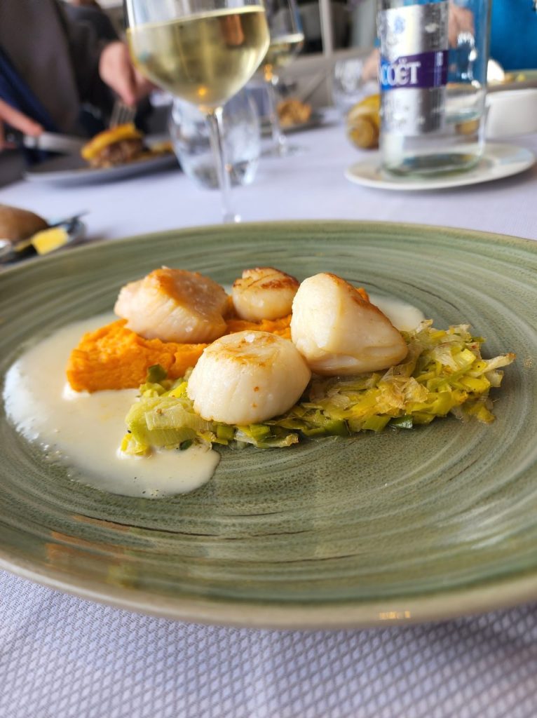 Filet de rouget barbet et noix de Saint Jacques poêlés, sauce safran, galette de houmous, caviar d’aubergines