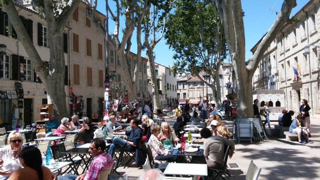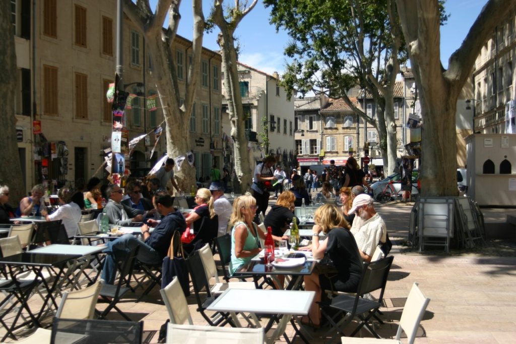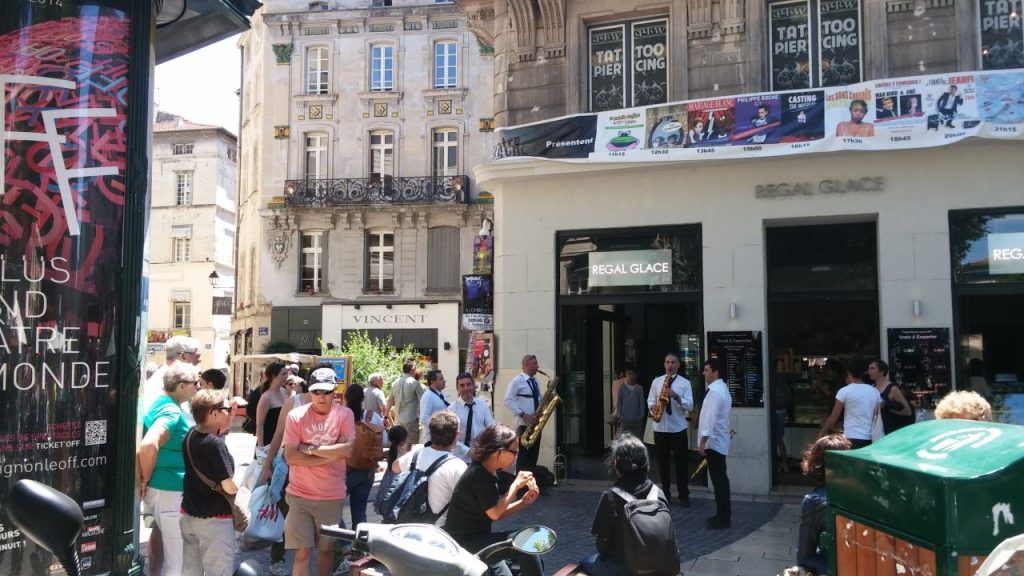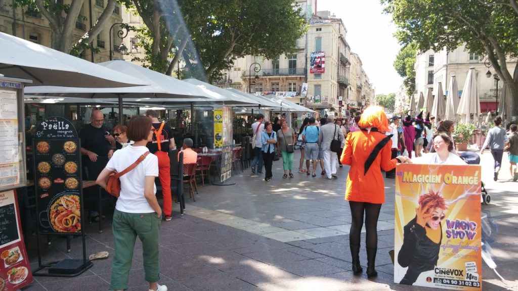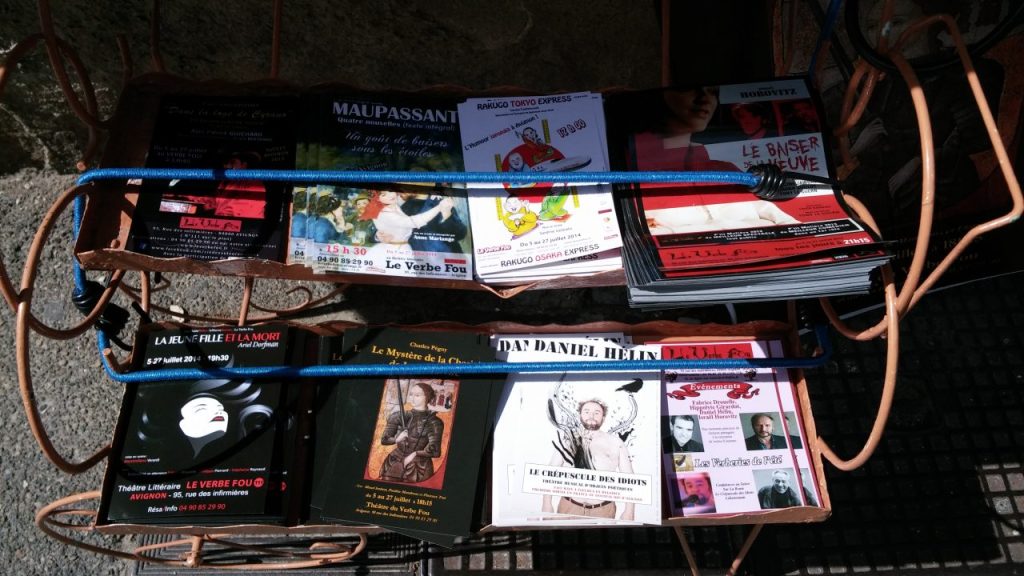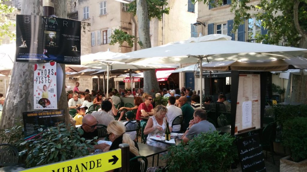 アヴィニョン旧市街の食事処は連日満席で、臨時のテラス席も一日中、演者や観光客でいっぱいに。こういう場所もアピールの絶好の場になるんですよ。