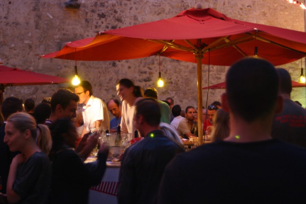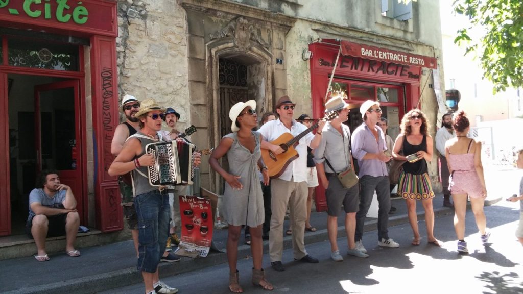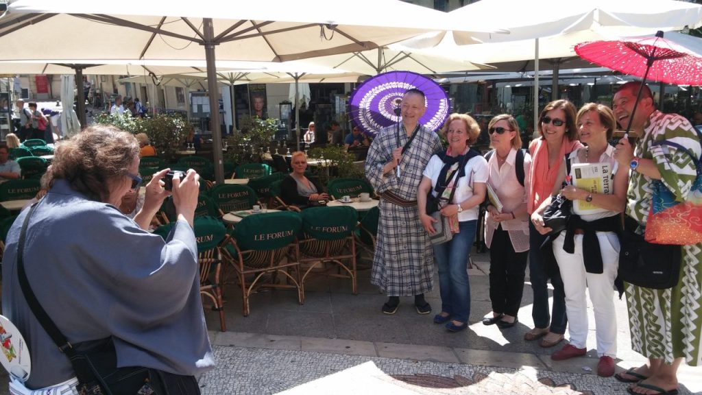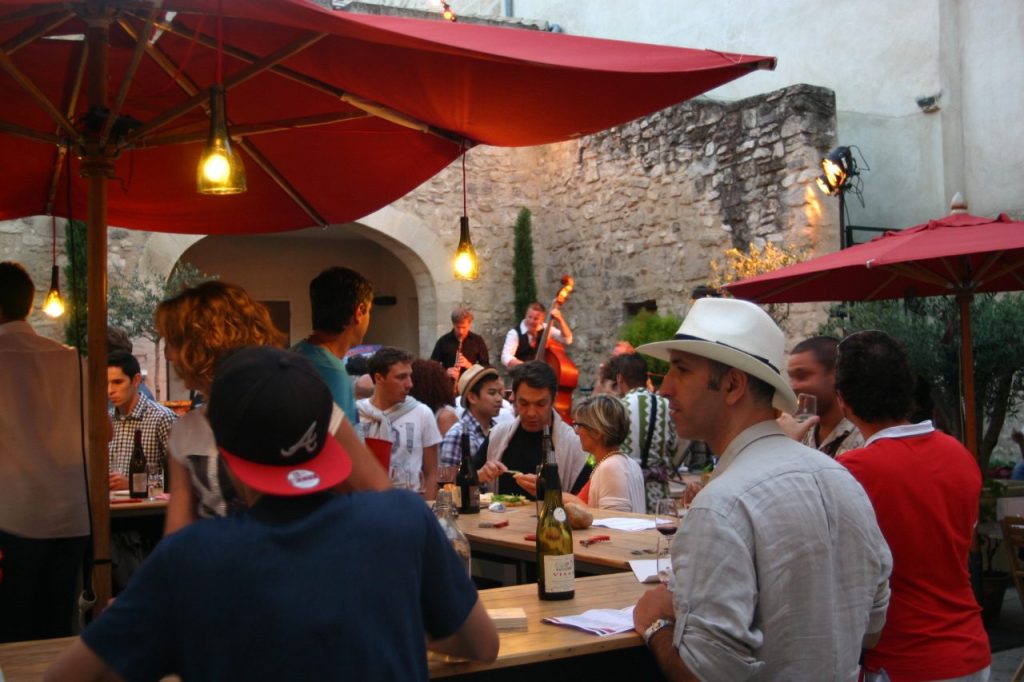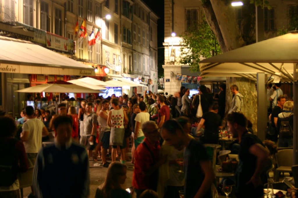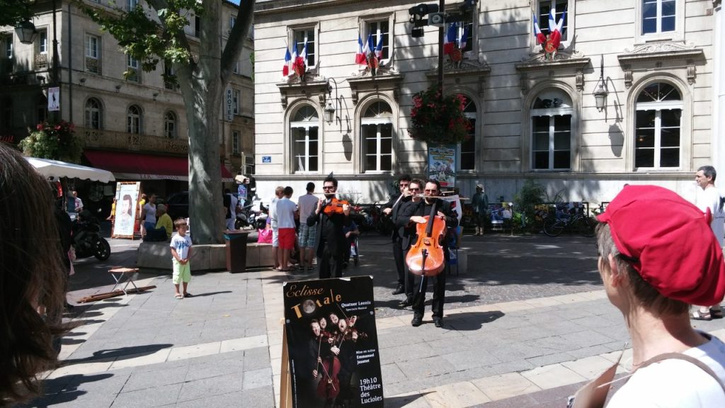 アヴィニョン旧市街の食事処は連日満席で、臨時のテラス席も一日中、演者や観光客でいっぱいに。こういう場所もアピールの絶好の場になるんですよ。
