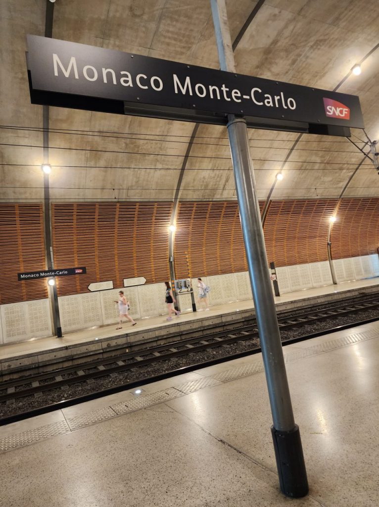 駅からすでにゴージャスなモナコの玄関、モナコ モンテ=カルロ駅(Monaco Monte-Carlo)は丘の上にある駅で、エレベーター、エスカレーターで海岸線まで降りてから街歩きが始まります。