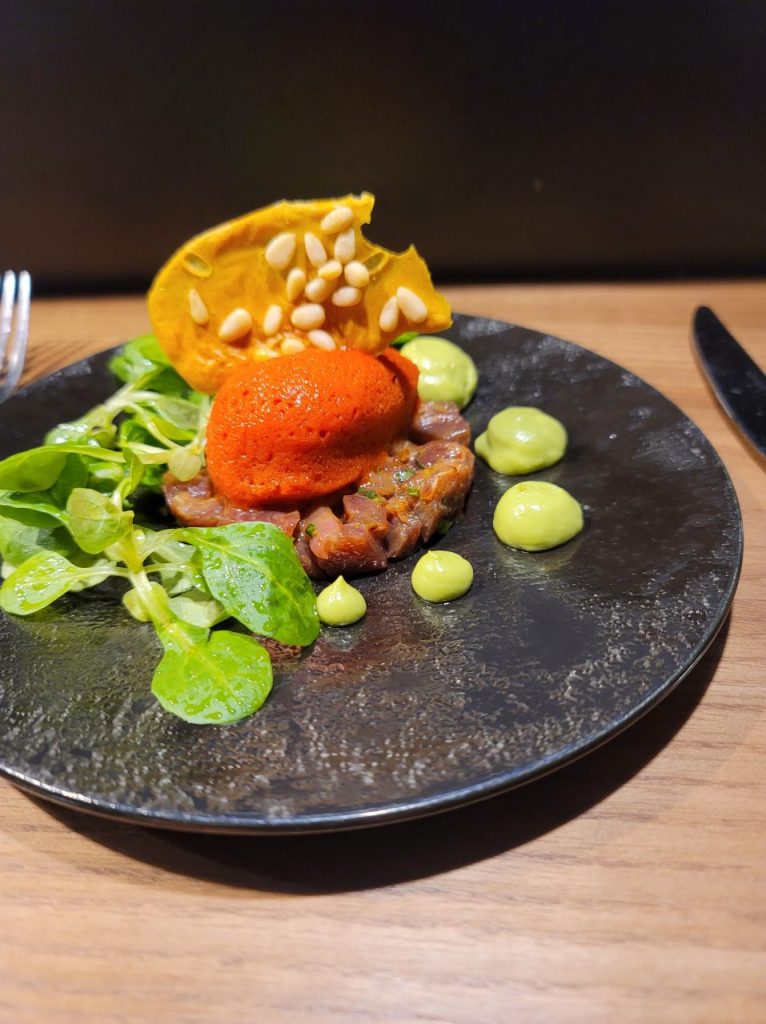 • Poisson du moment en tartare, crémeux avocat,sorbet poivrons rouge, mache de st julien, tuile auxpignons de pins