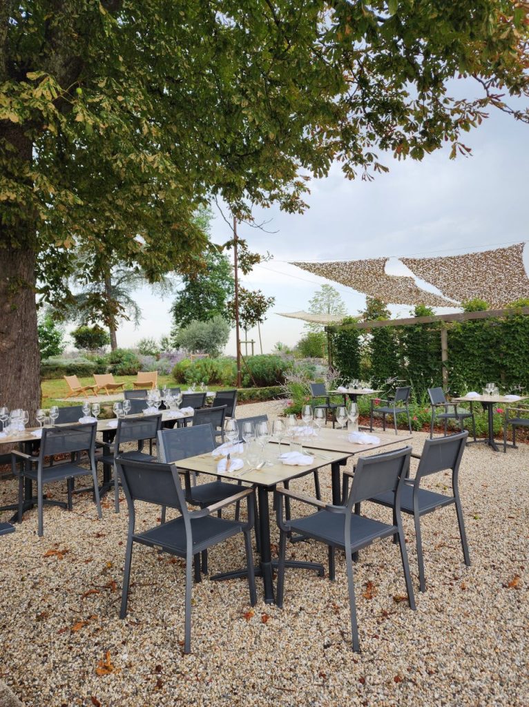 サン=テミリオンの村からは、歩いて20分、ブドウ畑の中にあるレストラン「Le Jardin」。これ以上ないロケーションでゆっくり食事が楽しめます。
