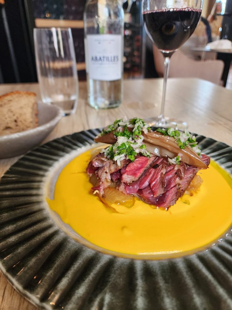 ÉMINCÉ DE FAUX-FILET DE RORUF LIMOUSIN GRILLÉ AU POIVRE, CRÈME DE CAROTTE, COCOTTE DE PÂTISSON DU POTAGER, AUBERGINE FONDANTE, VINAIGRETTE D’ÉCHALOTES ET PERSIL