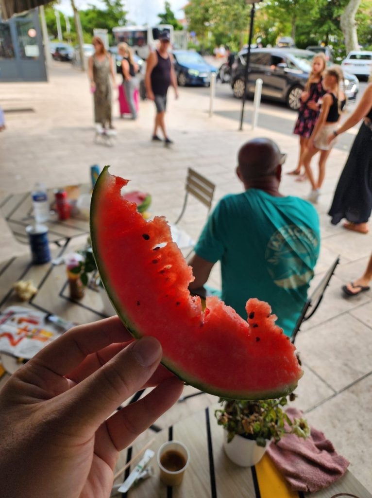 そのストアというのが実に愉快で、店先で食事中の陽気な店主が、チキンやポテト、スイカをくれました。(ランチぐらいの量)