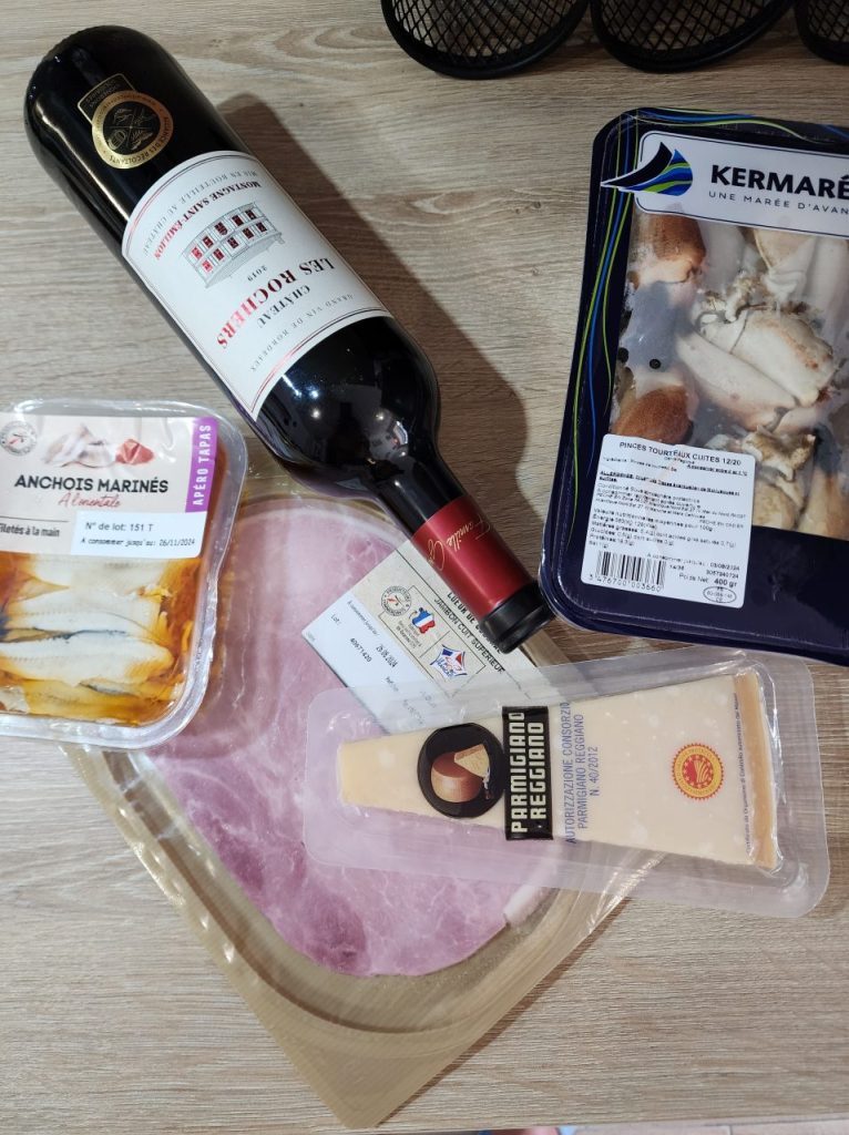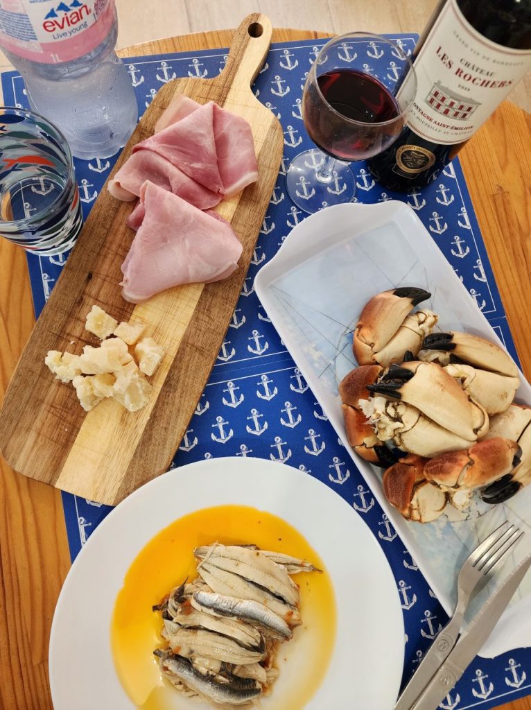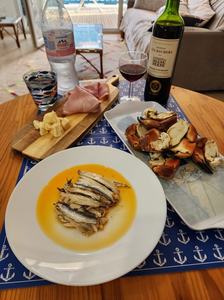クラブの爪、サーディンマリネ、ハム&チーズ、ワイン(サンテミリオン)。