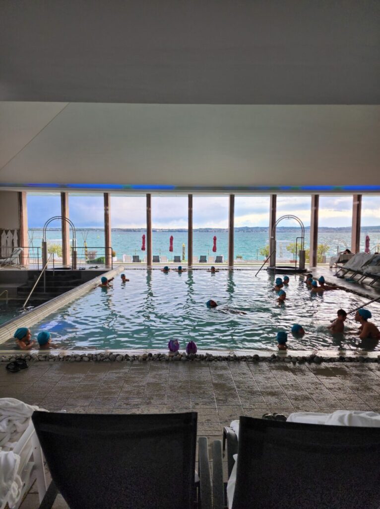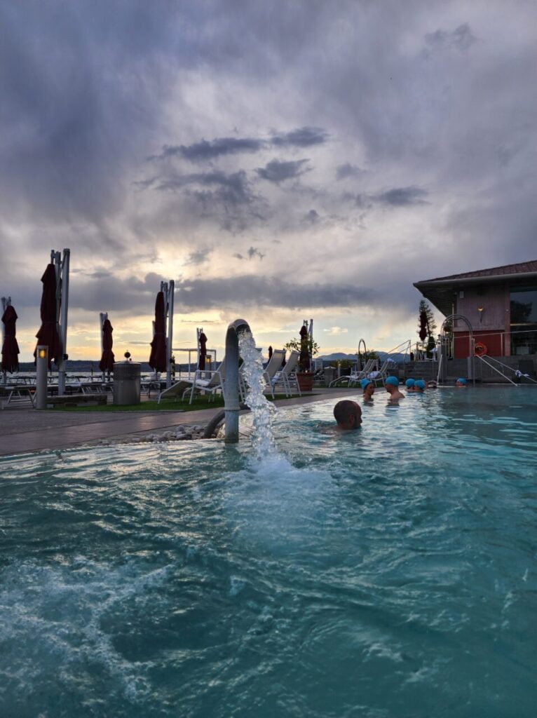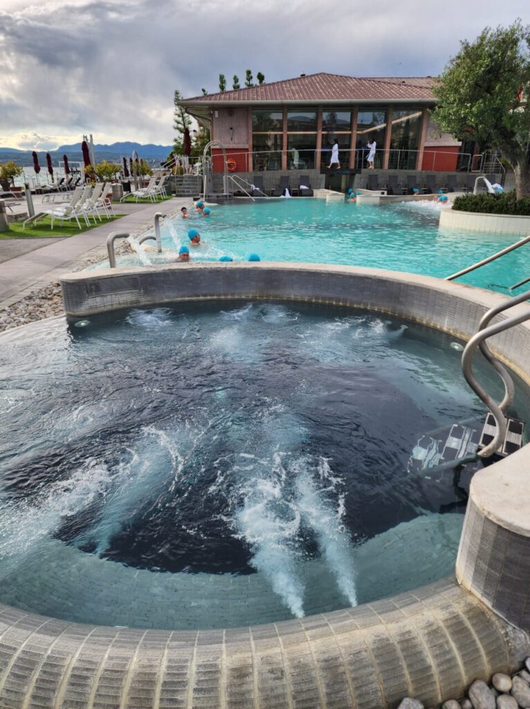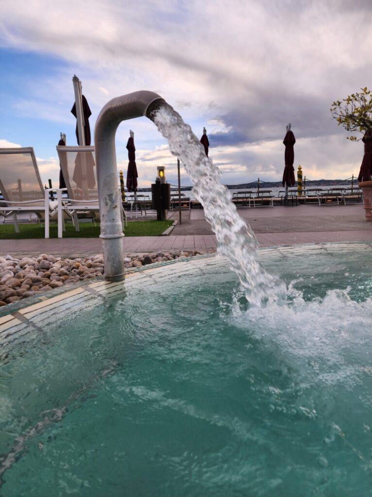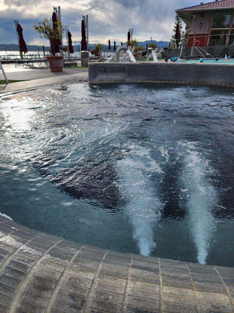 硫黄の香りがほんのりする、ここはまさに温泉そのもの。水温は36℃(源泉は69℃)でスパ、テルメには最適な温度に調整されていて実に気持ちいい。