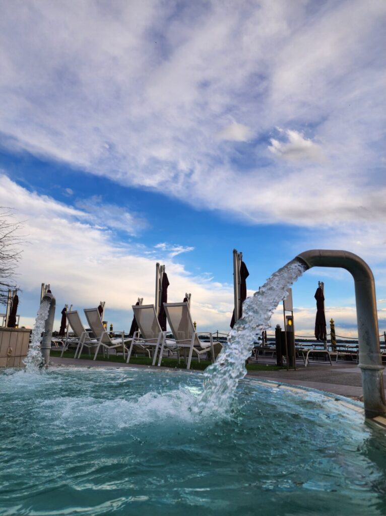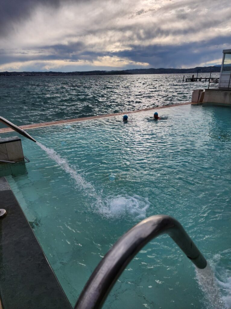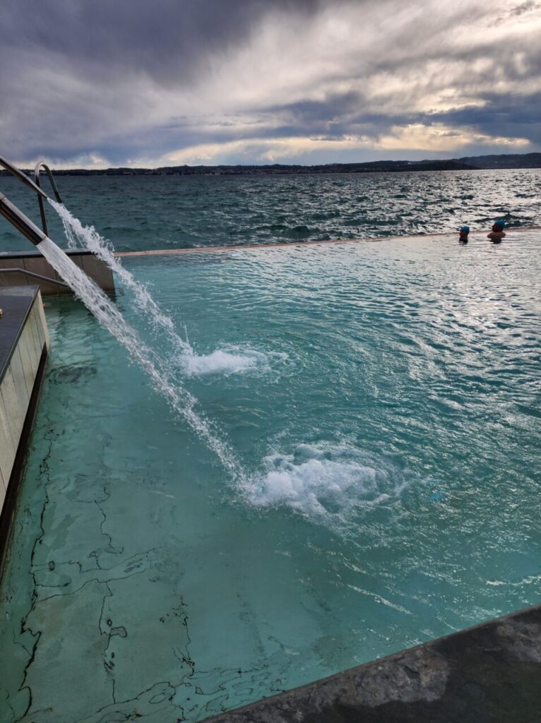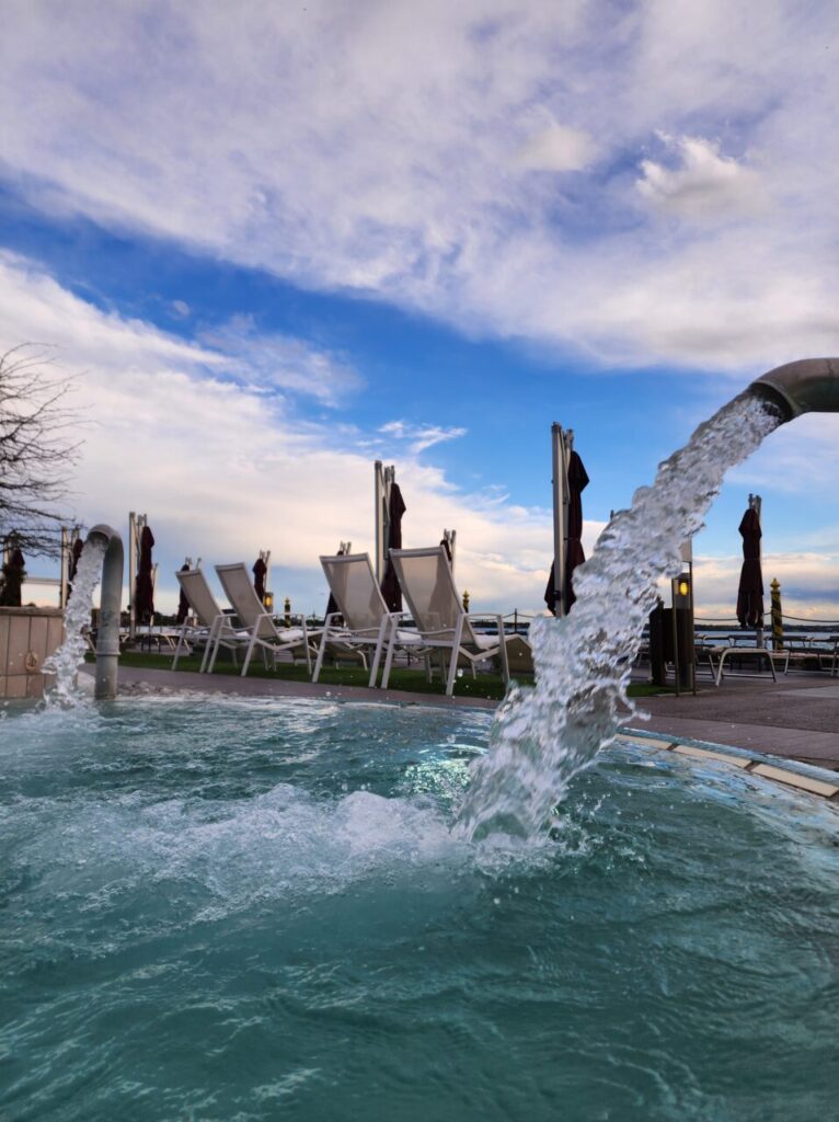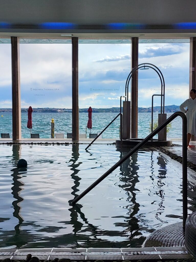 硫黄の香りがほんのりする、ここはまさに温泉そのもの。水温は36℃(源泉は69℃)でスパ、テルメには最適な温度に調整されていて実に気持ちいい。