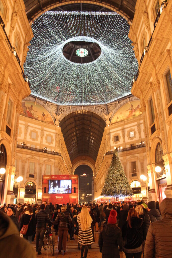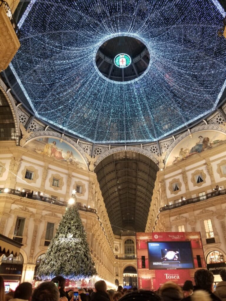 この年のヴィットーリオ・エマヌエーレ2世のガッレリア(Galleria Vittorio Emanuele II)では、SWAROVSKIのツリーの横で、直ぐ近くにあるイタリアオペラ界の最高峰、スカラ座(Teatro alla Scala)で行われているオペラが上映されていました。