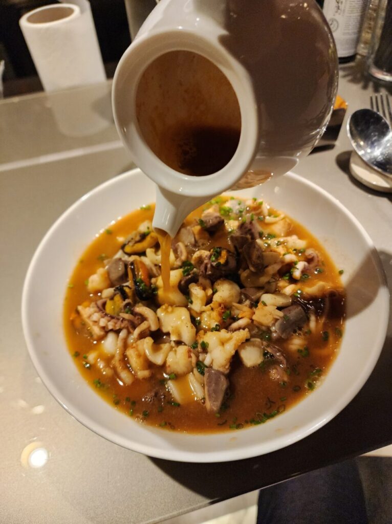 フレゴーラ(Fregola)は、イタリア・サルデーニャ島伝統のパスタで、直径2-3mmほど、豆粒状のショートパスタ。スープと一緒に茹でてしっかり出汁を吸わせる料理法。こちらのそれは、シーフードの濃厚スープ(フランスのスープドポワソンそのまま)を追いスープ掛けして、イカ、エビ、ムール、アサリ、カンパチたっぷりといただきます。