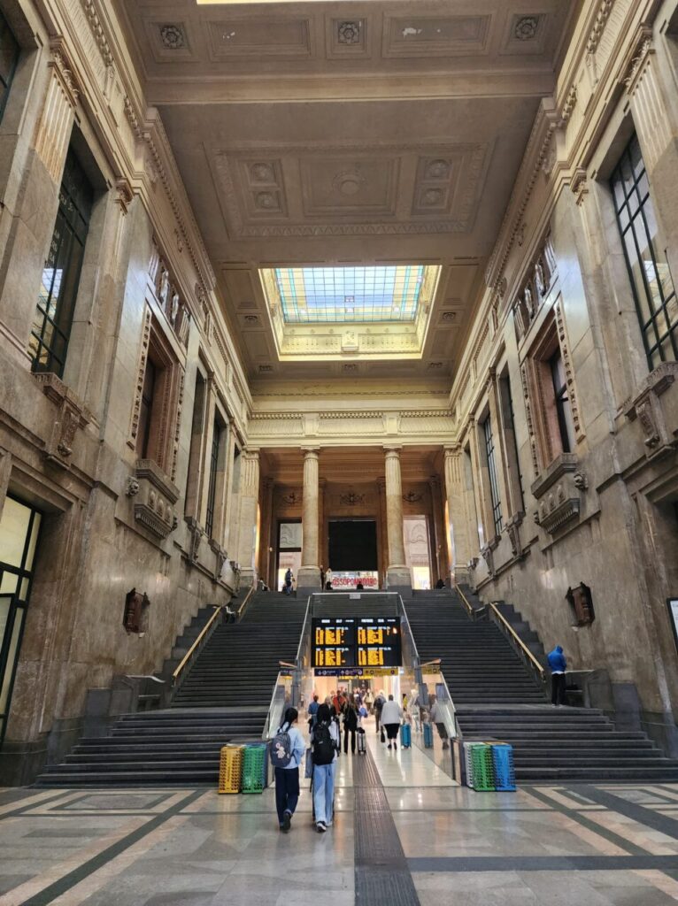 国際路線、国内路線合わせて一日平均500便、約32万人の旅客数は、ローマ・テルミニ駅に次ぐイタリアNo.2の巨大ターミナル駅で、「世界でもっとも美しい鉄道駅」とも呼ばれます。