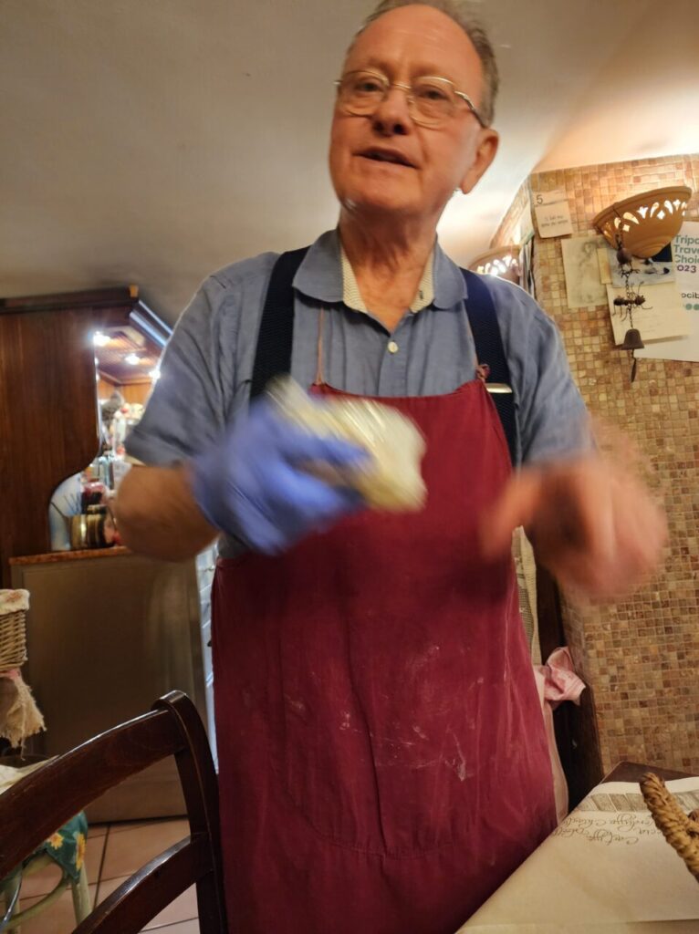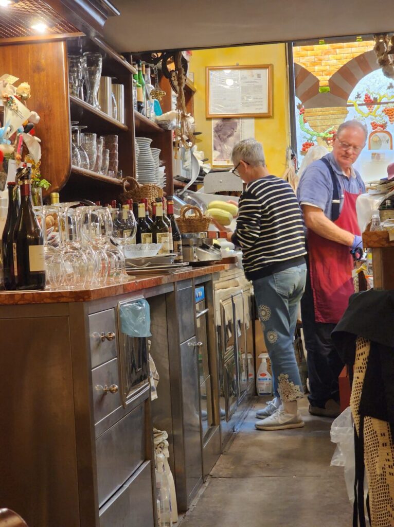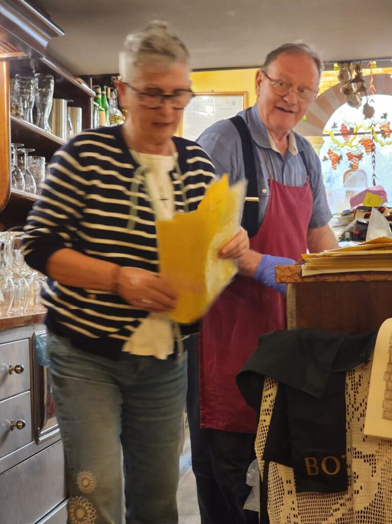 ご主人がチーズを切り、ワインを注ぎ、奥さまが作る料理に華を添えます。